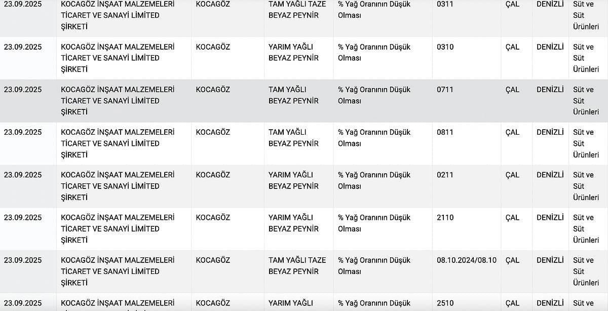 Tarım ve Orman Bakanlığı’nın denetimleri sonucunda birçok süt ve süt ürünü uygunsuz bulundu. Denizli merkezli Kocagöz markasının tam yağlı taze beyaz peynirinde olması gereken yağ oranının düşük olduğu tespit edildi.