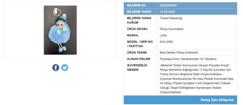 Güvensiz Ürün Bilgi Sistemi’nde yayınlanan duyuru kapsamında “Letra” markasına ait “Mavi Bebek Pelüş Anahtarlık” adlı ürünü yapılan mekanik testler sonucunda 3 yaş altındaki çocuklar için boğulma riski taşıdığı gerekçesiyle piyasadan toplatılıyor.