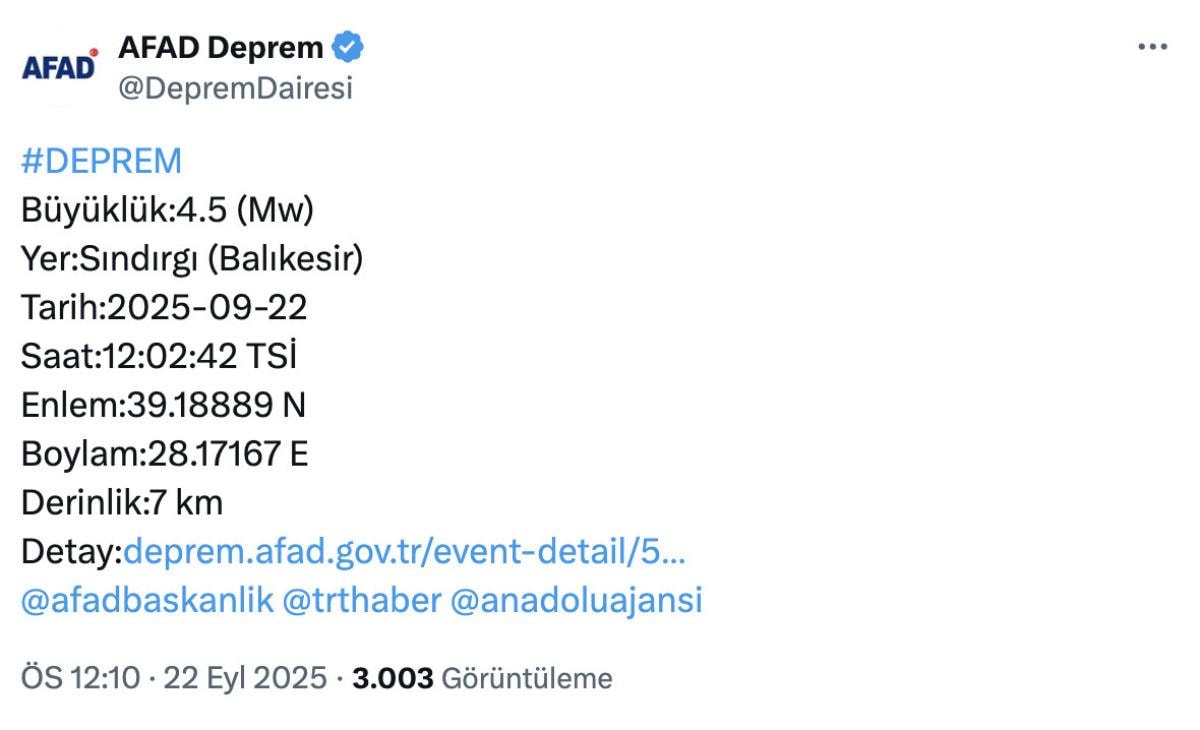 AFAD'ın NSosyal hesabından, Sındırgı'daki 4,5 büyüklüğündeki depreme ilişkin yapılan açıklamada, şunlar kaydedildi: