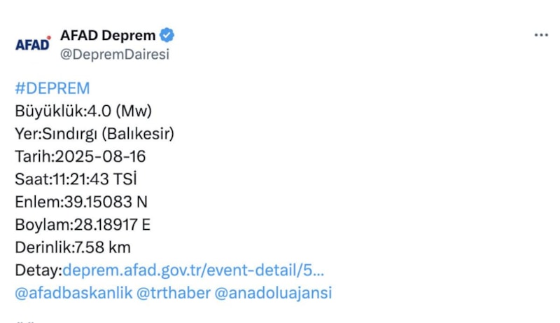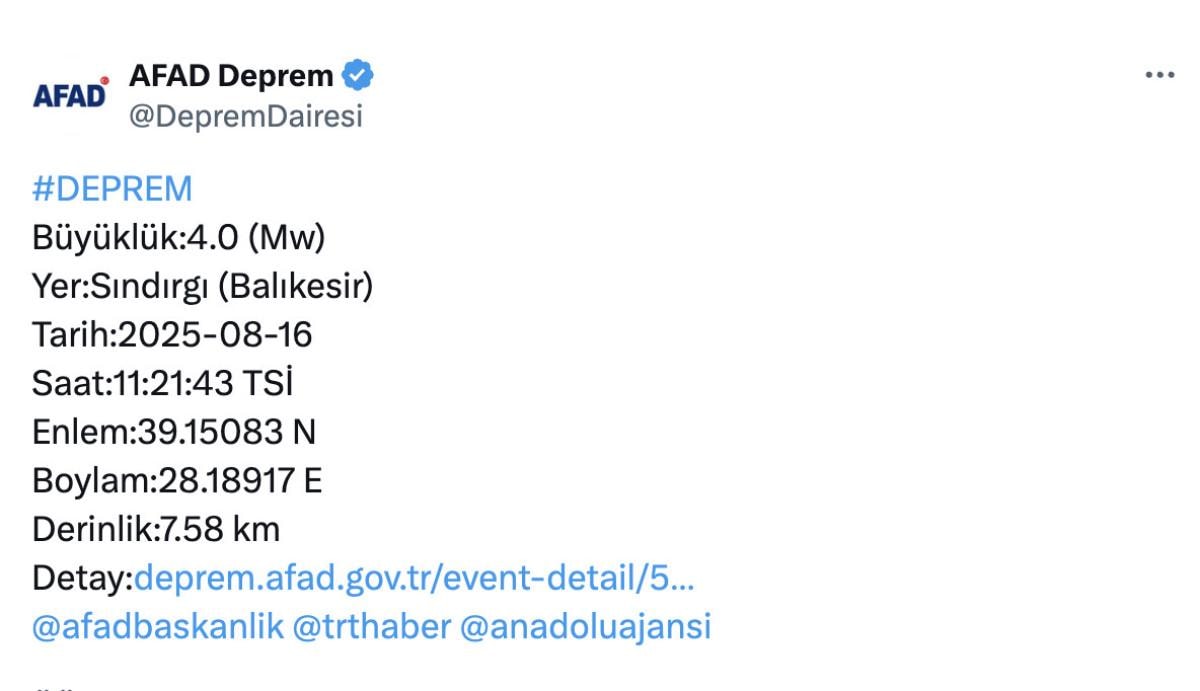 Afet ve Acil Durum Yönetimi Başkanlığı'ndan elde edilen verilere göre, merkez üssü Sındırgı'da 4.0'lük bir deprem yaşandı.