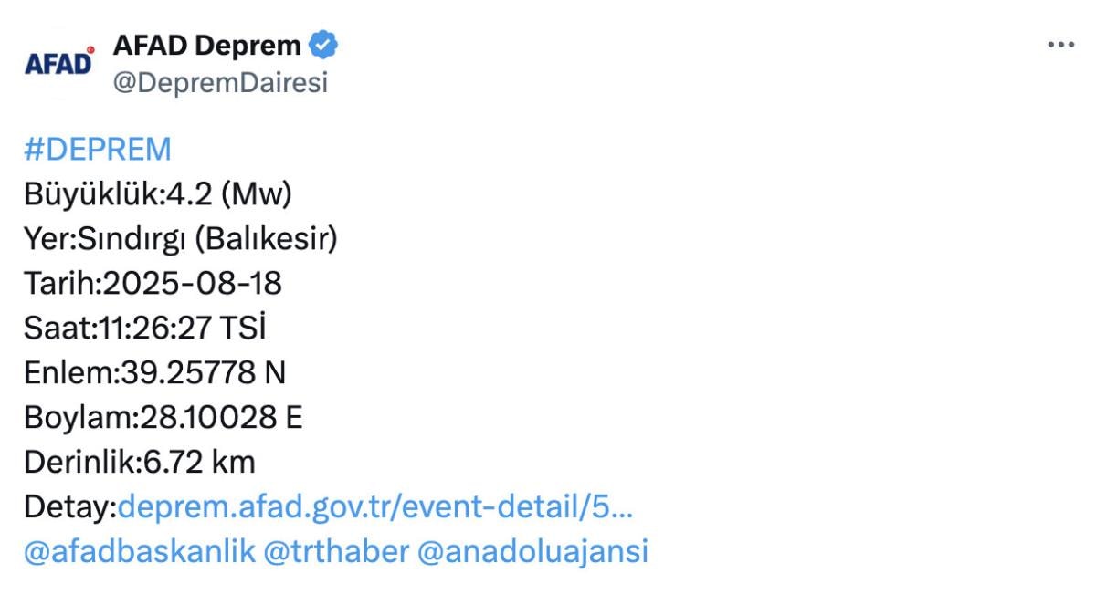 Afet ve Acil Durum Yönetimi Başkanlığı'ndan edinilen bilgilere göre, Balıkesir'in Sındırgı ilçesinde meydana gelen depremin büyüklüğü 4.2 olarak ölçüldü.