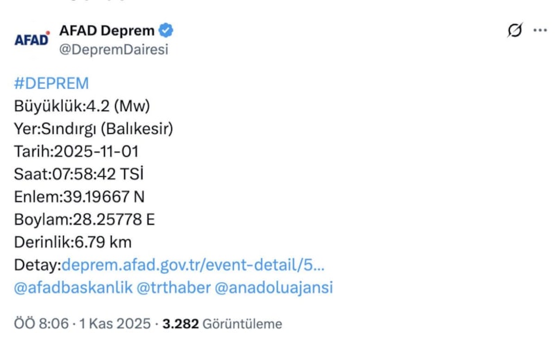 Afet ve Acil Durum Yönetimi Başkanlığının (AFAD) internet sitesinde yer alan bilgiye göre, merkez üssü Sındırgı ilçesi olan bir deprem meydana geldi.