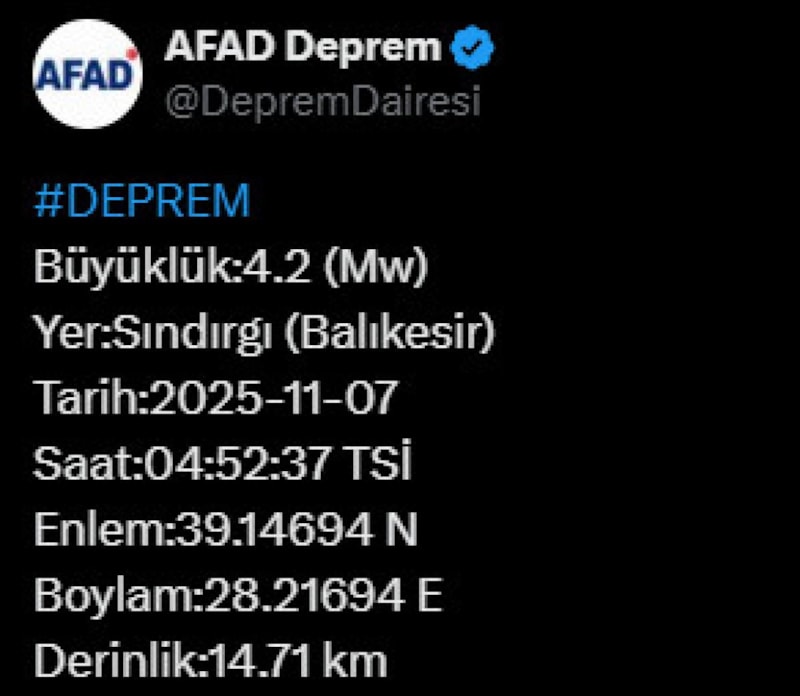 Afet ve Acil Durum Yönetimi Başkanlığı'nın internet sitesinde yer alan bilgiye göre saat 04.52'de merkez üssü Sındırgı ilçesi olan 4.2 büyüklüğünde sarsıntı kaydedildi.