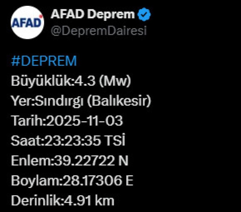 Afet ve Acil Durum Yönetimi Başkanlığı'nın internet sitesinde yer alan bilgiye göre saat 23.23'te merkez üssü Sındırgı ilçesi olan 4.3 büyüklüğünde sarsıntı kaydedildi.