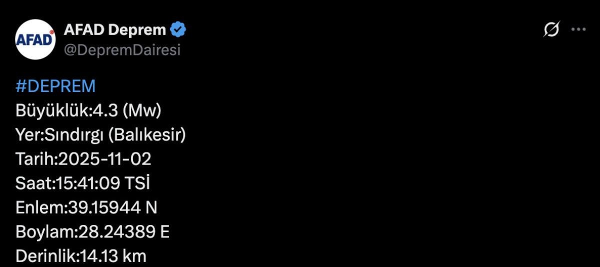 - Balıkesir Sındırgı'da 4.3 büyüklüğünde deprem oldu.