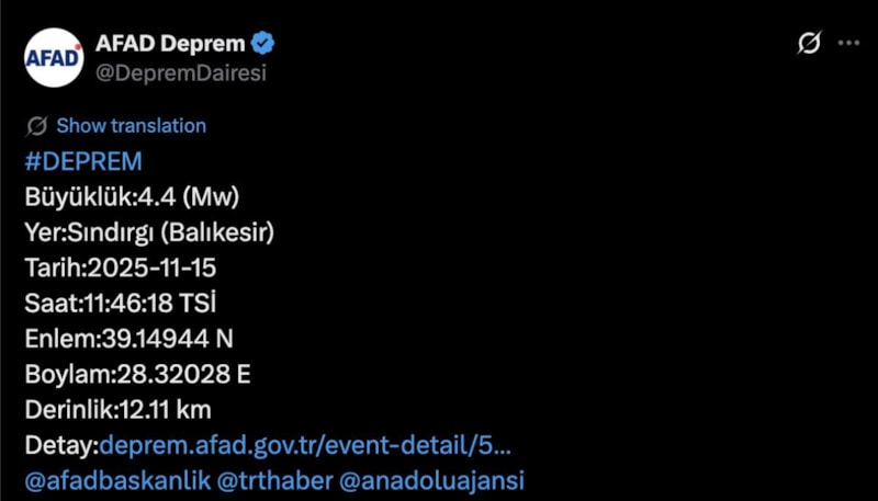AFAD'ın son dakika olarak paylaştığı bilgiye göre merkez üssü Sındırgı olan 4.4 büyüklüğünde bir deprem daha meydana geldi. Kaydedilen sarsıntının derinliği ise 12.11 kilometre olarak ölçüldü.