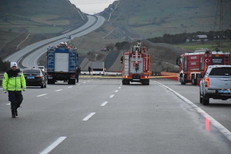 İstanbul-İzmir Otoyolu'nun Karesi mevkiinde yol kenarına düşen uçağın enkazı çevreye dağıldı.