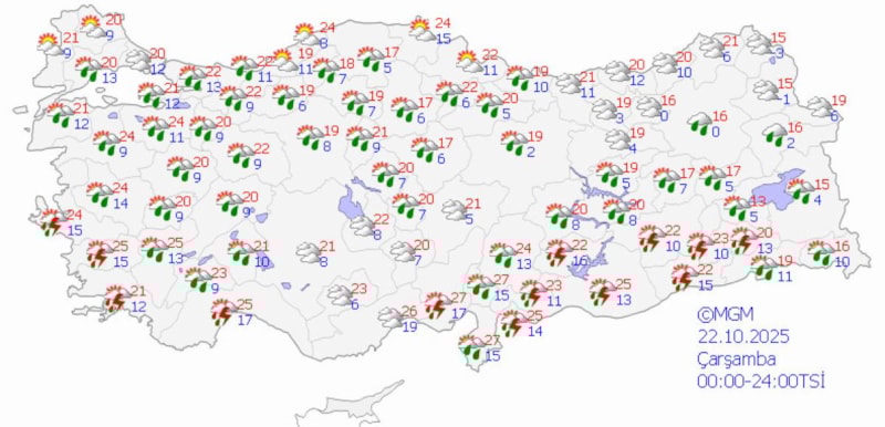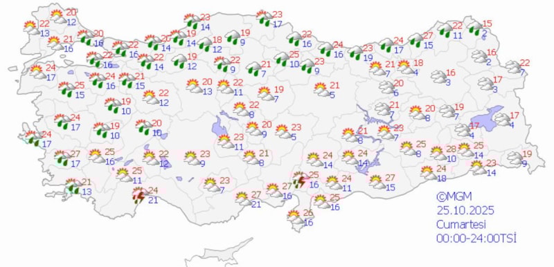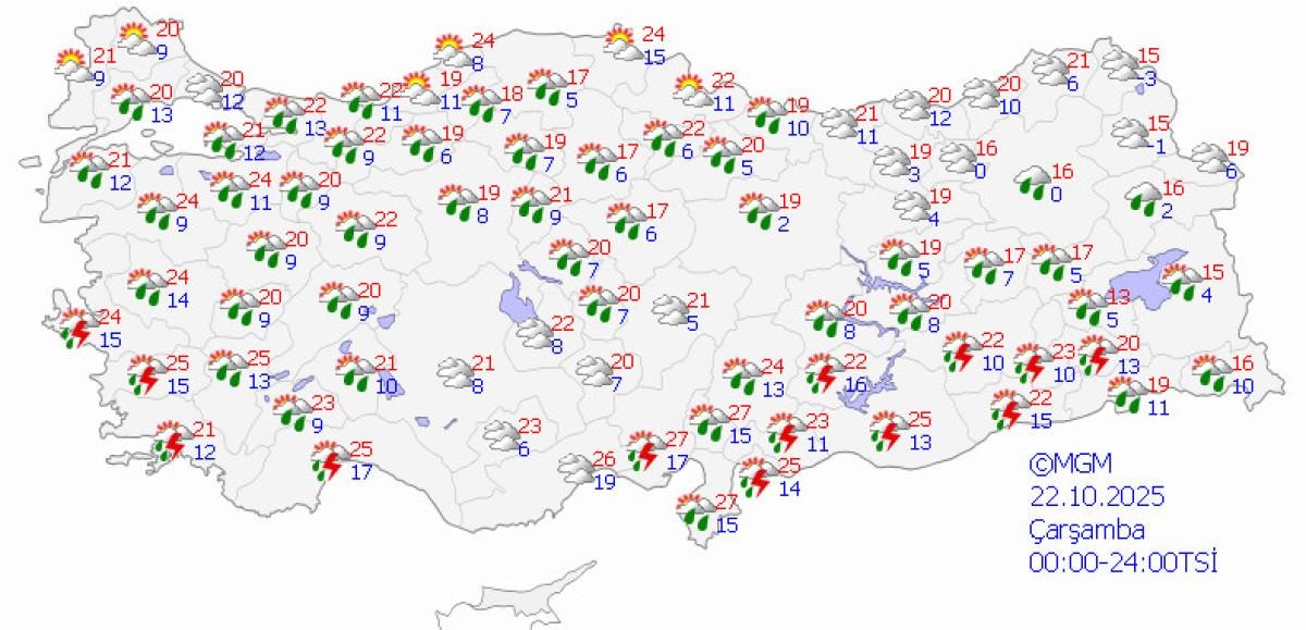 MGM, Muğla, Kıyı Ege, Van, Bitlis, Şırnak ve Siirt çevrelerinde yerel kuvvetli yağışlar için sarı kodlu uyarı yayınladı; ani sel, su baskını, yıldırım ve kısa süreli fırtınalara karşı tedbirli olunması istendi.