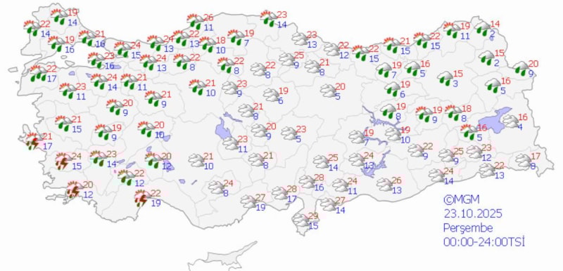 Ülke genelinde parçalı ve yer yer çok bulutlu hava hakim olacak, Ege, Akdeniz, Marmara'nın güney ve doğusu ile İç Anadolu'nun kuzeyinde sağanak ve gök gürültülü sağanak yağışlar bekleniyor.