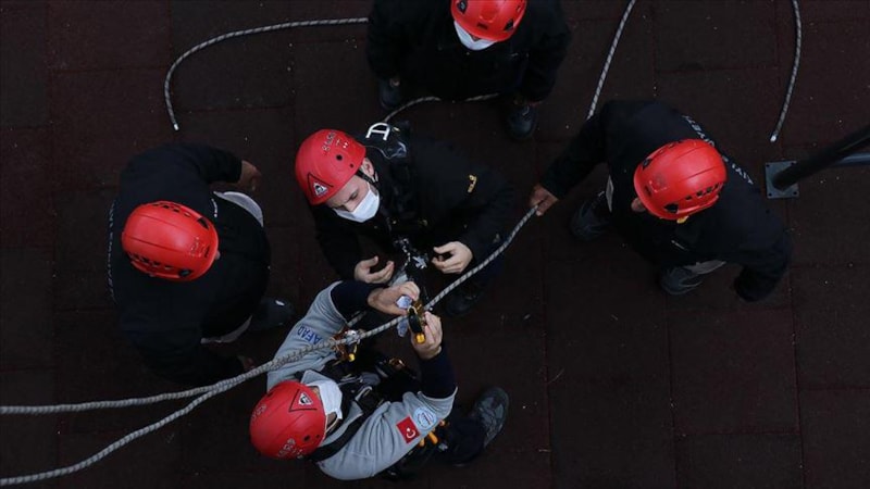 Yüksek katlardan yaralı indirme, enkazdan afetzedeleri çıkarma, enkaza güvenli yaklaşma konularında uygulamalı eğitimlerle pekiştiriliyor.