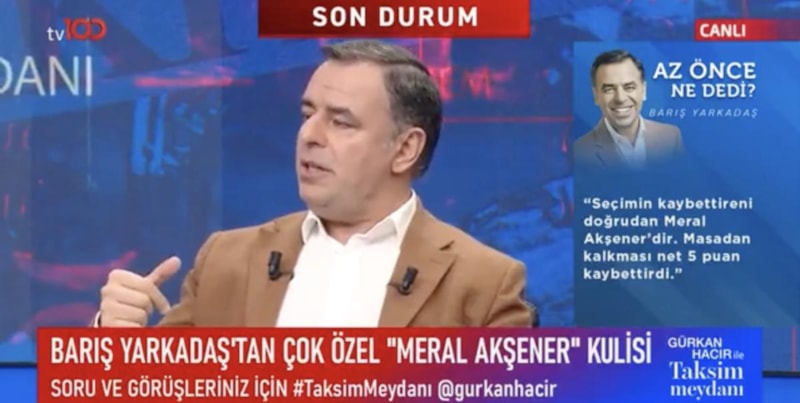 "14 ve 28 Mayıs seçimlerinin ardından Millet İttifakı, İYİ Parti'nin isteği üzerine dağıldı. Bu dağılmaya ilişkin hiçbir lider ne olup bittiğini kamuoyuna anlatmadı. Akşener de uzun süre sessizliğini korudu, bölüp pörçük açıklamalar yaptı. Sadece İYİ Parti kurultayında biraz işaretler verdi, kendi partisinin içindeki mevzulara ilişkin sert mesajlar verdi ve uzun süre sessizliğe büründü. Birden bire İYİ Parti'nin içinden, 'Yerel seçime kendi adayımızla girelim' gibi siyasi hedefinin ne olduğunu anlayamadığım sözler gündeme gelmeye başladı" diyen Yarkadaş, "Akşener 15 gün önce milletvekilleri ile basına kapalı bir grup toplantısı yaptı. Orada ilginç bir söz etti. 'Ben aslında geri dönmeyecektim ancak geri dönmemeye cesaret edemedim' dedi. Akşener'in masadan kalkması Millet İttifakı'na net 5 puan kaybettirdi. Bu seçimin kaybettireni doğrudan Akşener'dir. Hatta AK Parti meclis aritmetiğinde yüzde 30 oy beklerken yüzde 35'e çıktı. Bütün faturanın Kılıçdaroğlu'na kesilmesinin haksızlık odluğunu söylüyorum" ifadelerini kullandı.
