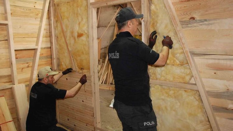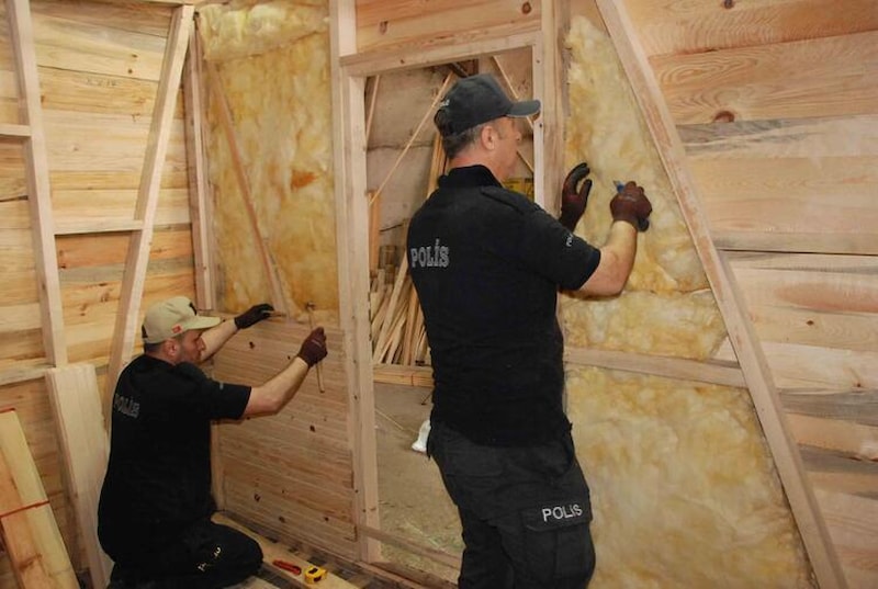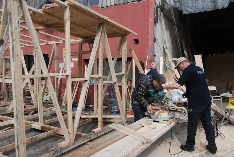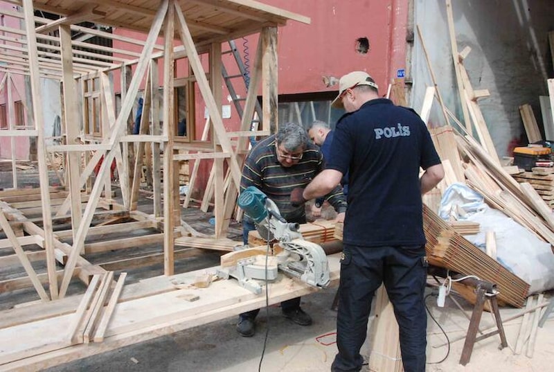 Bartın Emniyet Müdürlüğü'nde görevli 49 yaşındaki polis memurları Nazif Durak ve 47 yaşındaki İsmail Tirli, Ulus ilçesinde bulunan kereste fabrikasında gönüllü olarak çalışarak, depremden etkilenen bölgelerdeki emniyet müdürlüklerinin hizmetinde kullanılmak üzere evler yapmaya başladı.