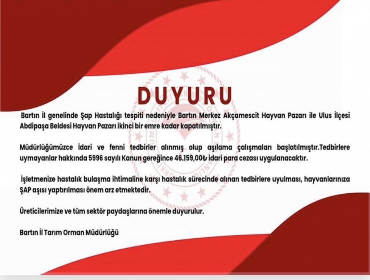 Bartın il genelinde şap hastalığı tespiti yapılması nedeniyle Bartın Merkez Akçamescit Hayvan Pazarı ile Ulus İlçesi Abdipaşa Beldesi Hayvan Pazarı ikinci bir emre kadar kapatılmıştır. Müdürlüğümüzce idari ve fenni tedbirler alınmış olup aşılama çalışmaları başlatılmıştır. Tedbirlere uymayanlar hakkında 5996 sayılı kanun gereğince 46 bin 159 TL idari para cezası uygulanacaktır. İşletmenize hastalık bulaşma ihtimaline karşı hastalık sürecinde alınan tedbirlere uyulması, hayvanlarınıza şap aşısı yaptırılması önem arz etmektedir. Üreticilerimize ve tüm sektör paydaşlarına önemle duyurulur.