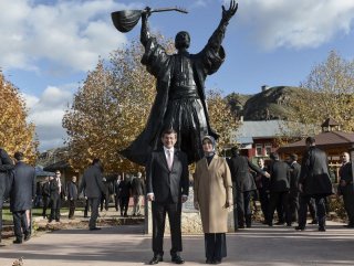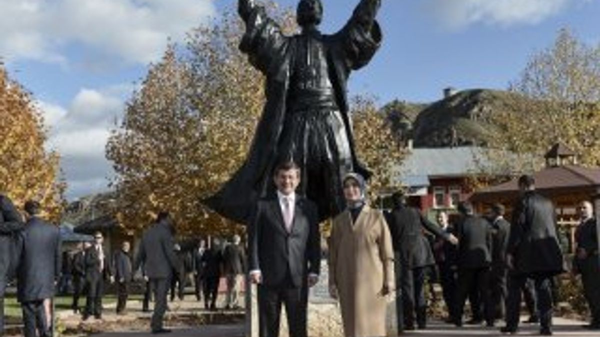 Başbakan Davutoğlu ve eşi Sare Davutoğlu Cem Evi önünde bulunan Pir Sultan Abdal heykeli önünde fotoğraf çektirdi.
