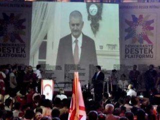 Başbakan Yıldırım da, video konferansla kalabalığa seslendi. 15 Temmuz’un hem Kuzey Kıbrıs halkı hem de Türkiye halkı için demokrasi tarihinde önemli bir dönüm noktası olduğunu ifade eden Yıldırım, “Bu darbe, milletin dik durması, demokrasiden yana tavır koyması ve milletin geleceğine sahip çıkmasıyla birlikte başarısızlığa uğramıştır. Bu darbenin önlenmesinde en büyük paylardan bir tanesi de Cumhurbaşkanımız Recep Tayyip Erdoğan’ın ülkesine, milletine olan sevdasıdır. Bu olay nasıl Türkiye’de parti farkı olmadan 79 milyonu kenetlediyse, herkes meydanlarda demokrasi nöbetine başladıysa KKTC’de de öyle oldu. Türkiye Cumhuriyeti Başbakanı olarak Lefkoşa meydanında sizlerle beraberim, sizlerle demokrasi nöbetindeyim" diye konuştu.