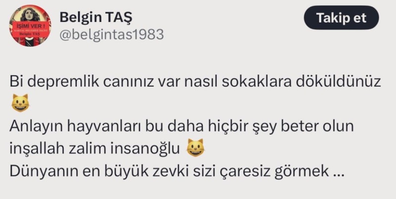 "Bir depremlik canınız var nasıl sokaklara döküldünüz. Anlayın hayvanlar bu daha hiçbir şey beter olun inşallah zalim insanoğlu. Dünyanın en büyük zevki sizi çaresiz görmek…”