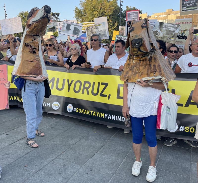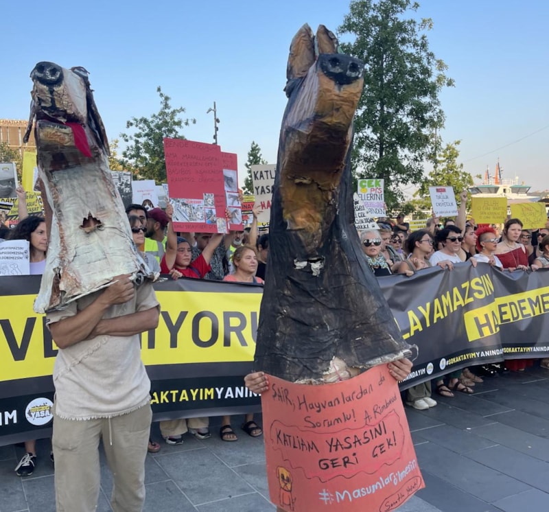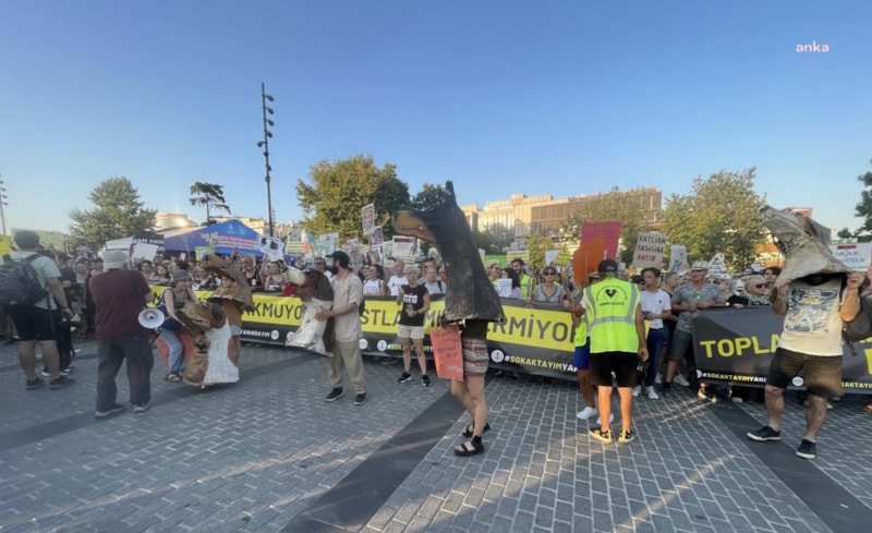 Başıboş sokak köpeklerinin toplum güvenliğini tehdit etmesine engel olmak için TBMM'de görüşülen düzenlemeye karşı çıkan hayvan dernekleri üyeleri düzenledikleri protestoda köpek maskeleri taktı.