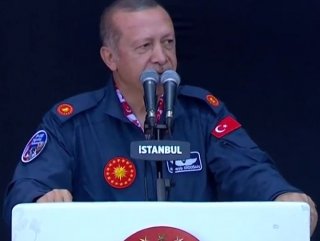 Gençlerin karşıladığı Erdoğan'ın üzerinde Cumhurbaşkanlığı forsunun bulunduğu pilot üniforması giydiği görüldü.