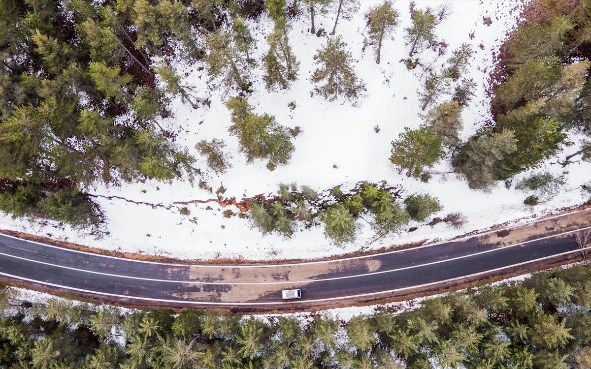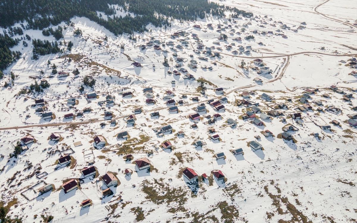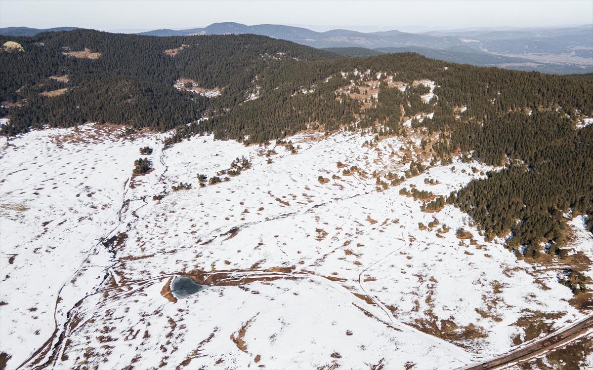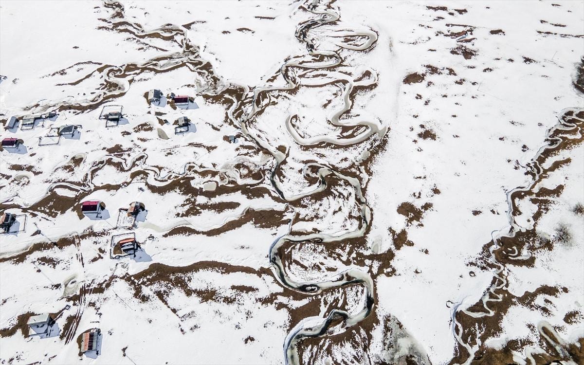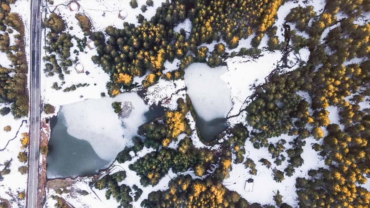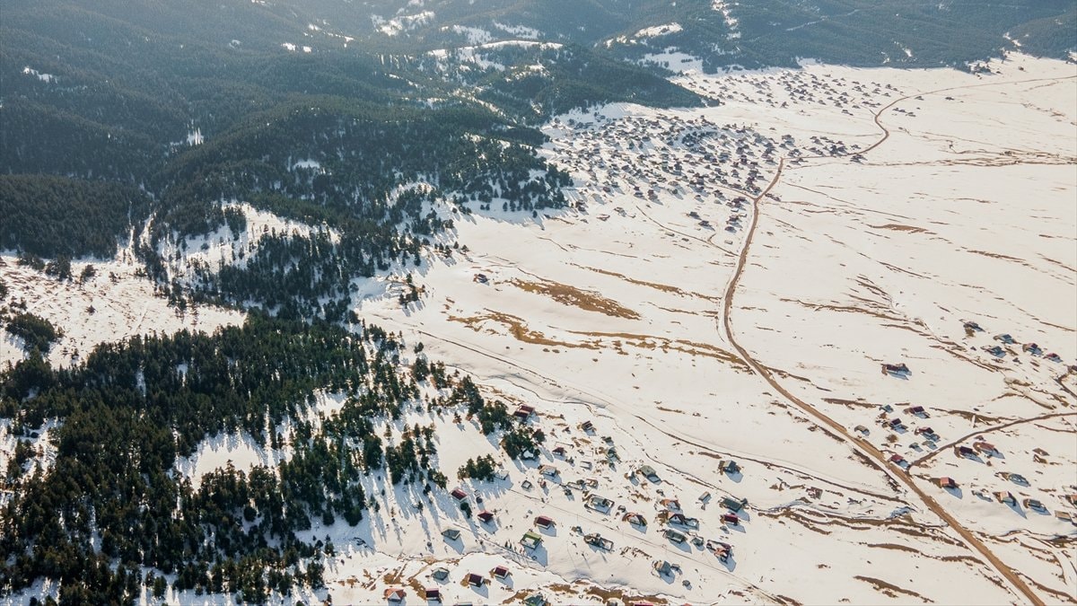 Başkent'in doğal güzellikleriyle bilinen ilçesi Çamlıdere'de, kar yağışı ile yeşilin buluşması havadan görüntülendi.