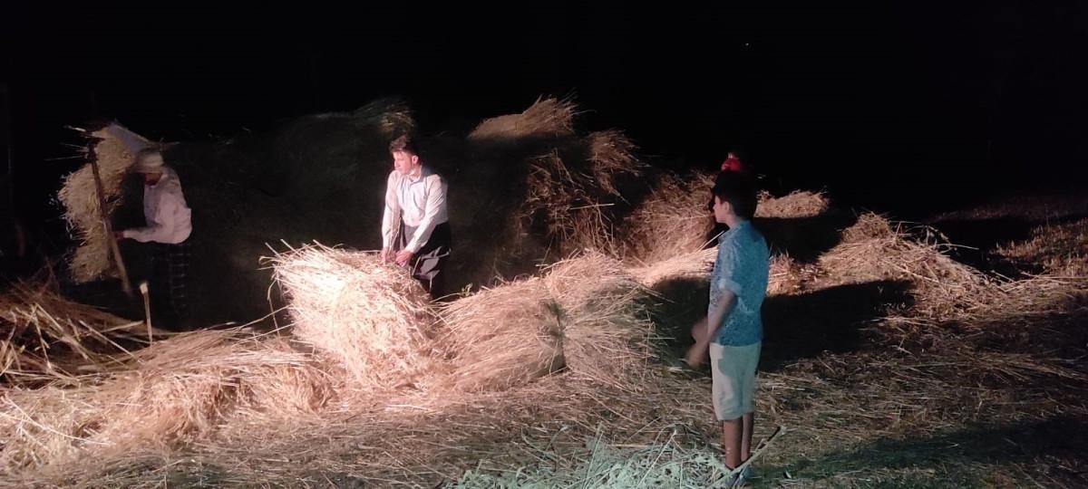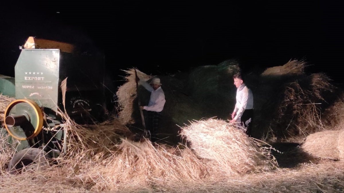 Güneşin altında çalışmakta zorlanan çiftçiler, gece mesaisinde imece usulüyle tarlalarını biçiyor, hasat etikleri buğday ve arpaları taşıyarak patoz yapıyor.