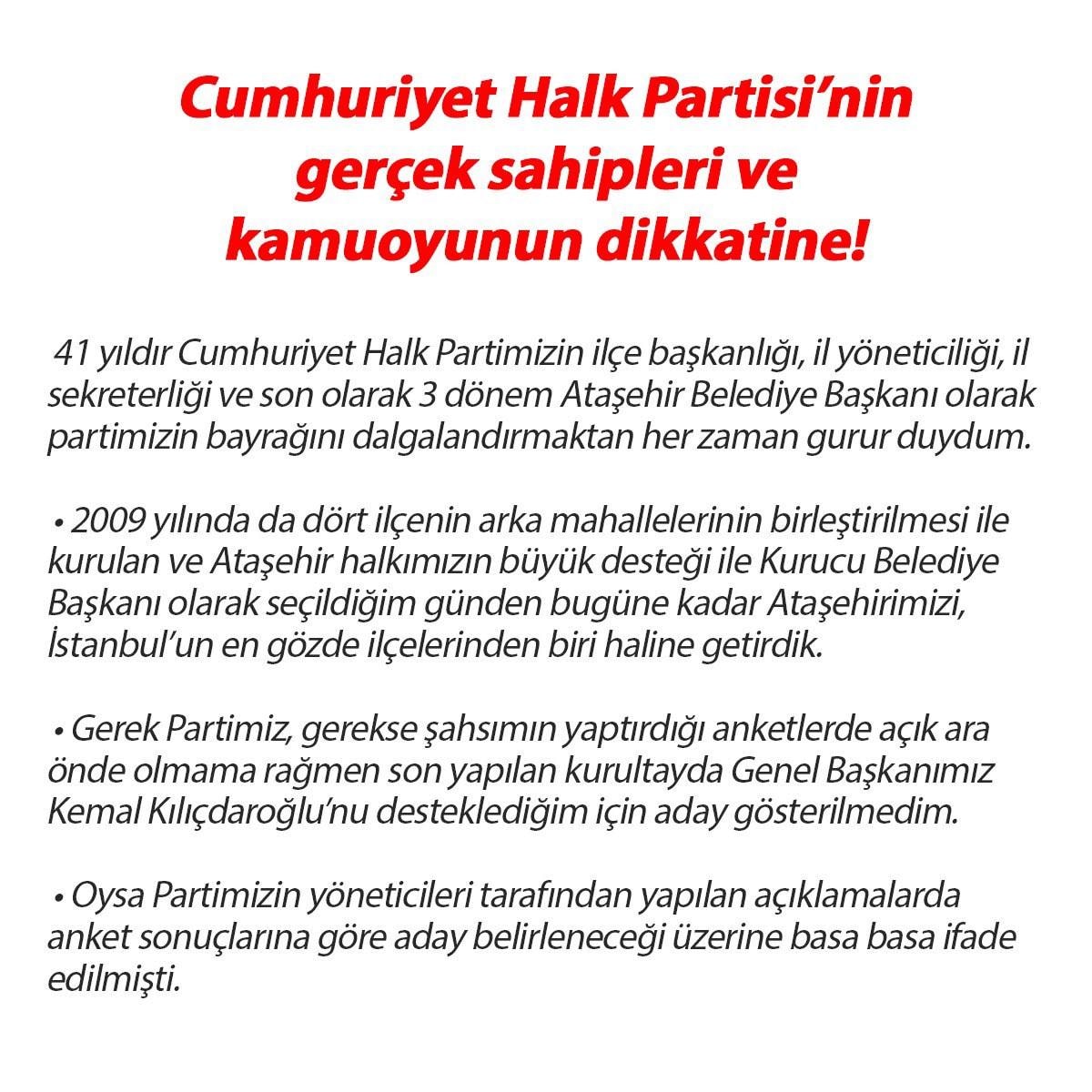 26 Ocak Cuma günü sabah saat 09.00’da İBB Başkanı Sayın Ekrem İmamoğlu şahsımı makamına davet ederek benimle bir görüşme gerçekleştirdi. Ekrem İmamoğlu, Ataşehir’de belediye başkan adayı olarak benimle yol yürümeyeceği kararını şahsıma ifade etti. Bu kararı bana ilettiğinde partimizin en üst kurulları olan ve aday belirlemede tek yetkili merci olan MYK ve PM henüz toplanmamıştı. Yani Ataşehir ile ilgili bir karar alınmamıştı. Yüzyıllık Ulu Çınar olan Partimizin hukuki işleyişi ve parti kültüründe üst kurullarında karar alınmadan böylesi bir kararı tarafıma tebliğ etmeye İBB Başkanı'nın görev ve yetkisi yoktur. Bu kararı alacak kurul, MYK ve PM’dir. Buradan soruyorum herkese, İBB Başkanı Sayın Ekrem İmamoğlu, şahsımla ilgili hangi görev ve yetki ile böyle bir karar veriyor ve partimizin üst kurullarının karar alma yetkisini hangi hakla kullanıyor? Tüm bunların neticesinde aday yapılmadım diye istifa ettiğimi düşünenlere ifade etmek isterim ki, Cumhuriyet Halk Partisi’ne yıllarını veren her bir yol arkadaşımın hakkını hukukunu korumak ve partimin kurumsal kimliğine sahip çıkmak için istifa ettim.”