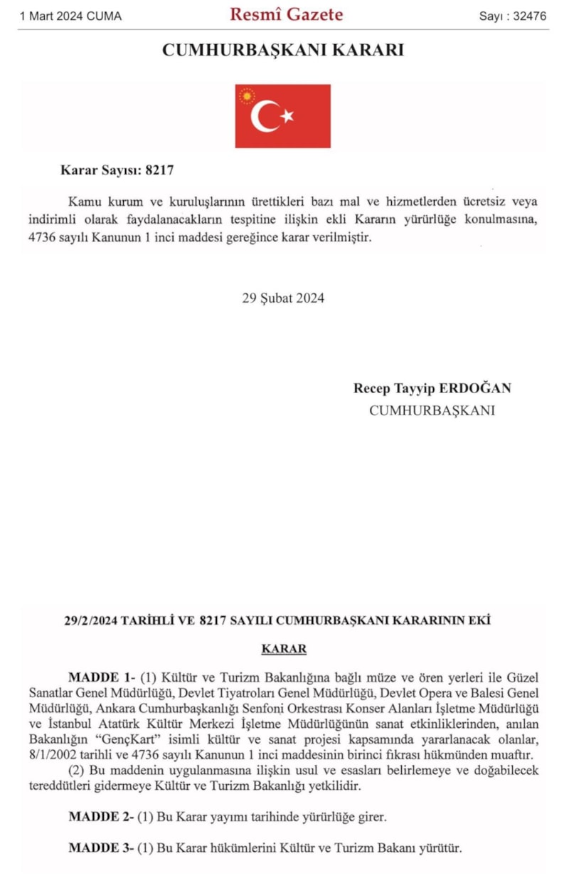 "GençKart" ile 18 yaşına giren gençler, Bakanlığa bağlı müze ve ören yerleriyle Güzel Sanatlar Genel Müdürlüğü, Devlet Tiyatroları Genel Müdürlüğü, Devlet Opera ve Balesi Genel Müdürlüğü, Ankara Cumhurbaşkanlığı Senfoni Orkestrası Konser Alanları İşletme Müdürlüğü ve İstanbul Atatürk Kültür Merkezi İşletme Müdürlüğü'nün sanat etkinliklerinden ücretsiz ya da indirimli faydalanabilecek.