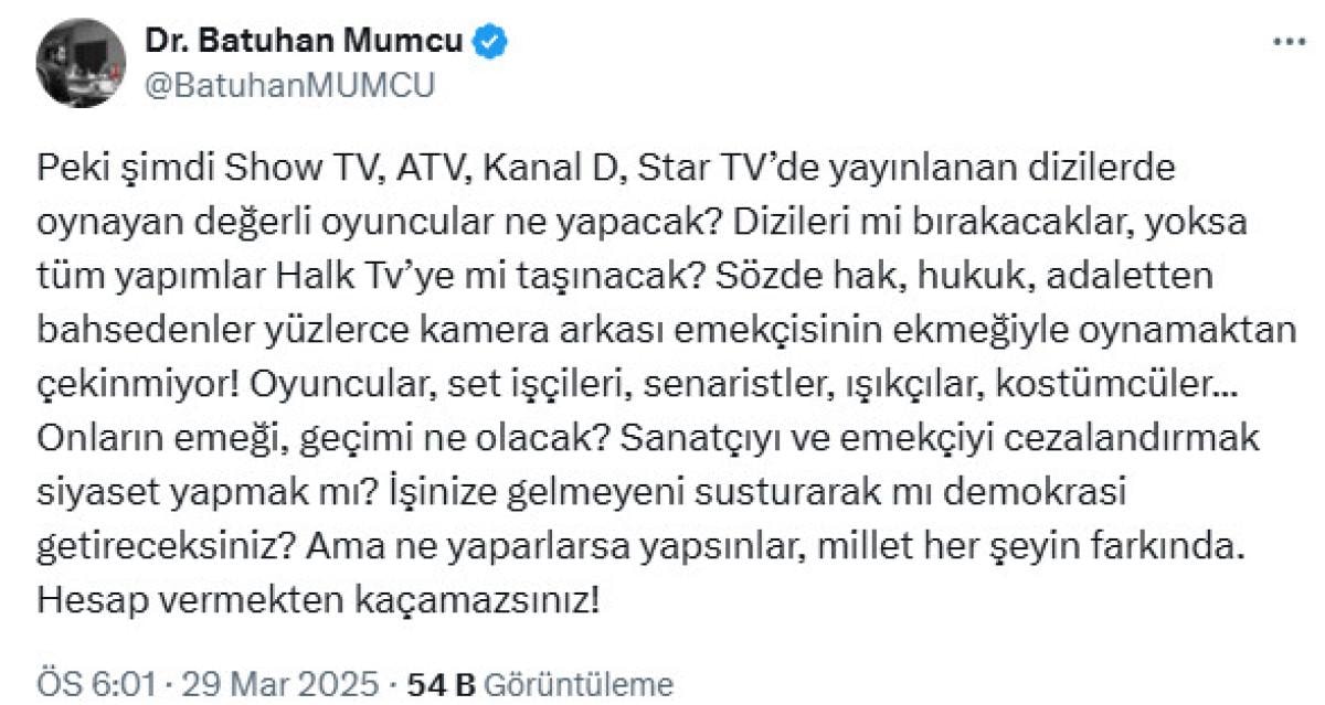 Oyuncular, set işçileri, senaristler, ışıkçılar, kostümcüler... Onların emeği, geçimi ne olacak? Sanatçıyı ve emekçiyi cezalandırmak siyaset yapmak mı? İşinize gelmeyeni susturarak mı demokrasi getireceksiniz? Ama ne yaparlarsa yapsınlar, millet her şeyin farkında. Hesap vermekten kaçamazsınız!