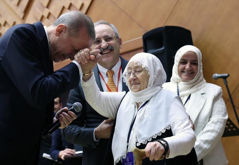 Salonda alkışlanan sözlerin ardından Cumhurbaşkanı Erdoğan, Alime Nine'nin ellerinden öptü.