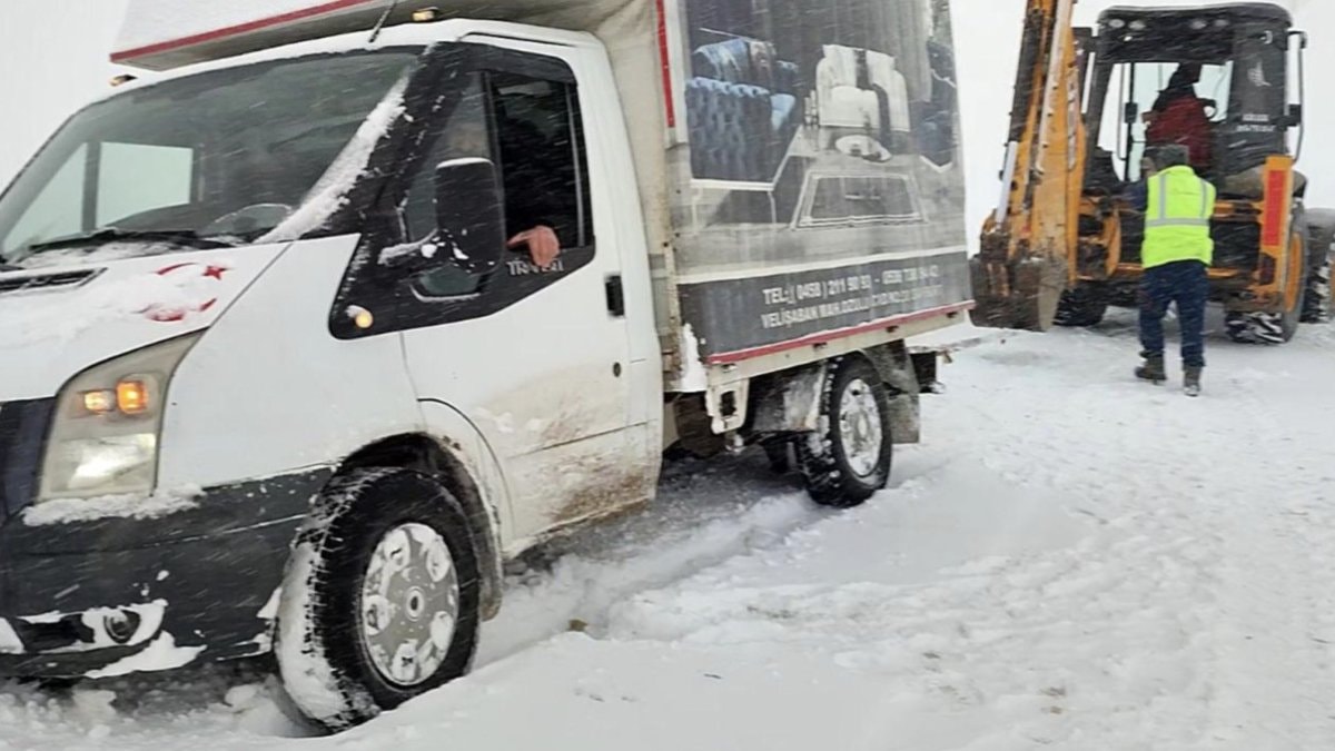 Kar nedeniyle görüş mesafesi azalınca yolda ilerlemekte zorluk çeken mobilya yüklü kamyonetin sürücüsü Ahmet Bozo, aracı ile mahsur kaldı.