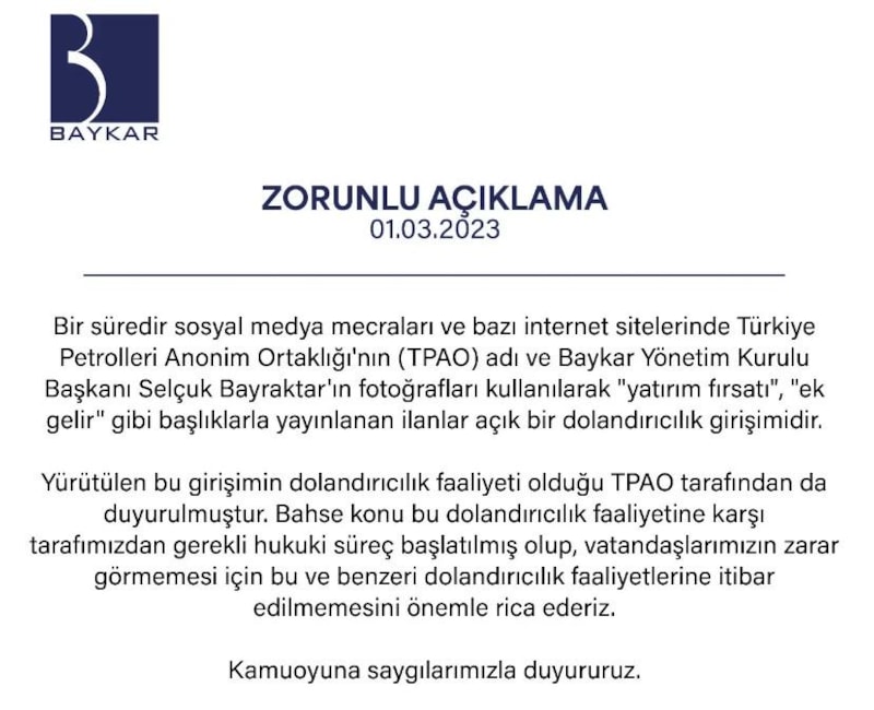 Açıklama yapan Baykar, Türkiye Petrolleri Anonim Ortaklığı'nın (TPAO) adının da yer aldığı "yatırım fırsatı", "ek gelir" gibi başlıklarla yayınlanan ilanların açık bir dolandırıcılık girişimi olduğuna dikkati çekti.
