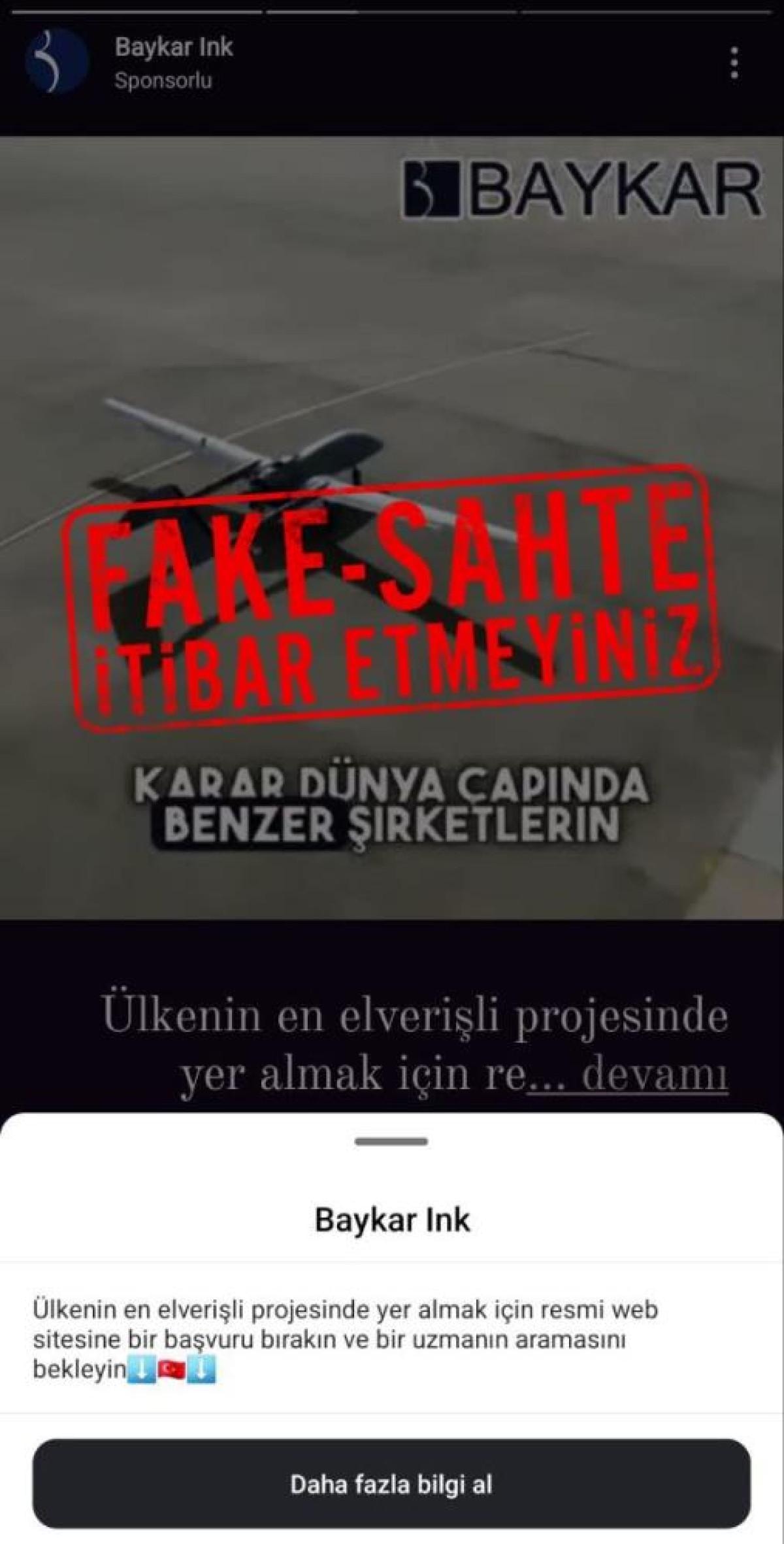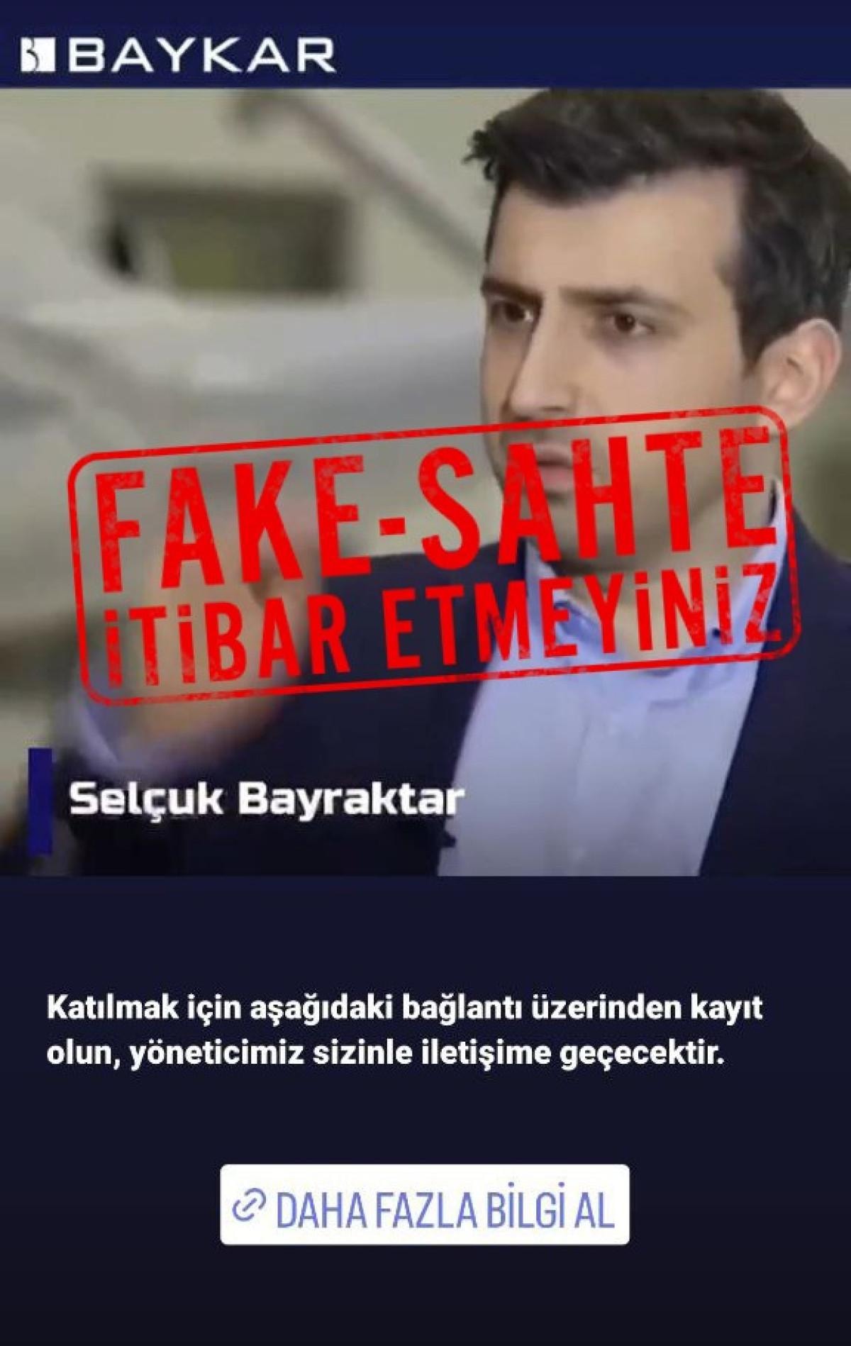"Bir süredir internet siteleri ve sosyal medya platformlarında, Baykar’a yatırım yaparak gelir elde edebileceğinize dair sahte ilanlar, haber benzeri içerikler ve videolar dolaşıma sokulduğunu görmekteyiz. Gerçekliği olmayan bu tür ilan, haber ve videolarda yapay zeka desteğiyle şahsıma aitmiş gibi duran konuşma ve görüntüler kullanılmaktadır. Bu açıklama, video ve röportajlar benzeri içerikler kesinlikle gerçek dışıdır ve dolandırıcılık amacıyla illegal bir şekilde yayılmaktadır. Bir kez daha hatırlatmak isterim ki; halka açık bir şirket olmayan Baykar, hiçbir zaman yatırım teklifi ya da önerilerinde bulunmamaktadır. Bu tarz dolandırıcılık girişimlerine yönelik olarak hukuki süreçlerimiz devam etmektedir. Tüm vatandaşlarımızdan bu tür içeriklere karşı dikkatli olmalarını ve itibar etmemelerini önemle rica ederim."