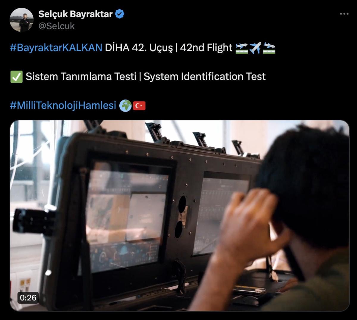 Selçuk Bayraktar da test uçuşunu sosyal medya hesabından paylaştı. Bayraktar paylaşımında, "Bayraktar Kalkan DİHA 42. uçuşu. Sistem Tanımlama Testi" ifadelerini kullandı.
