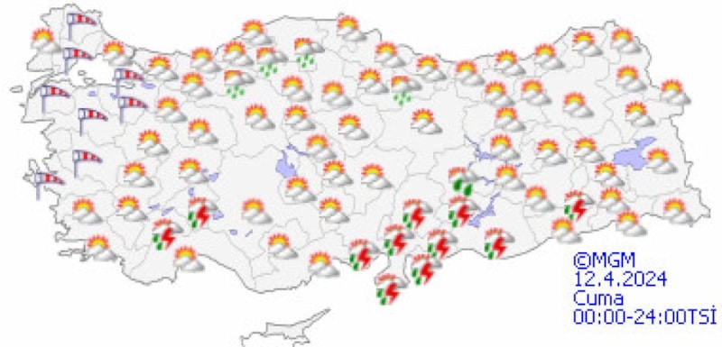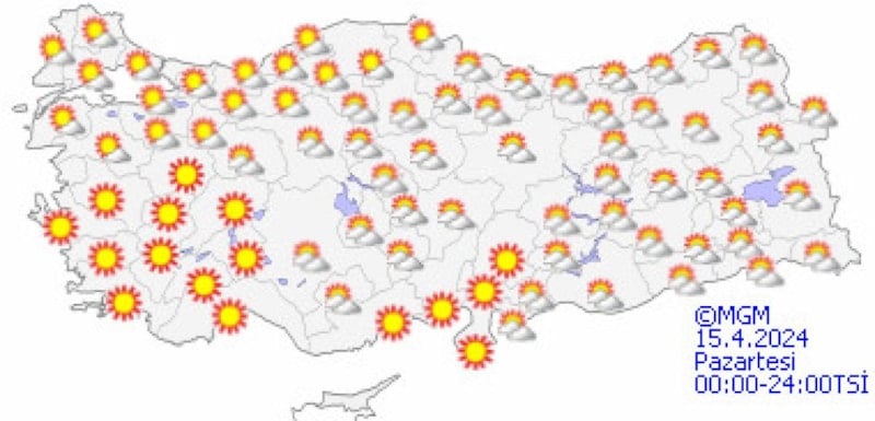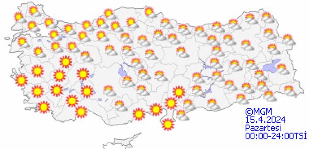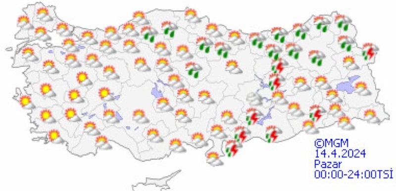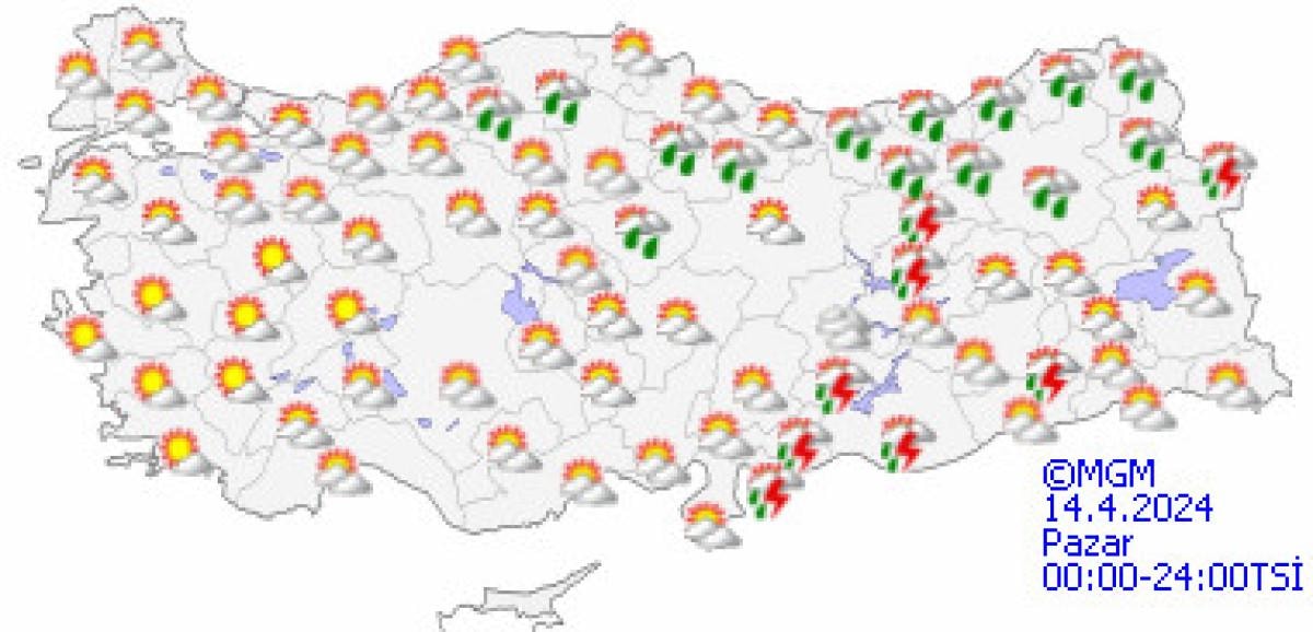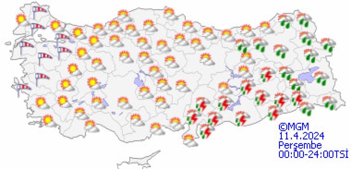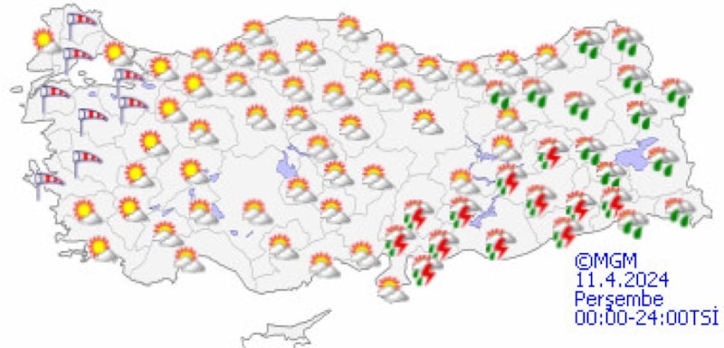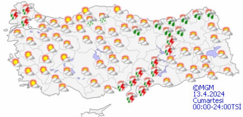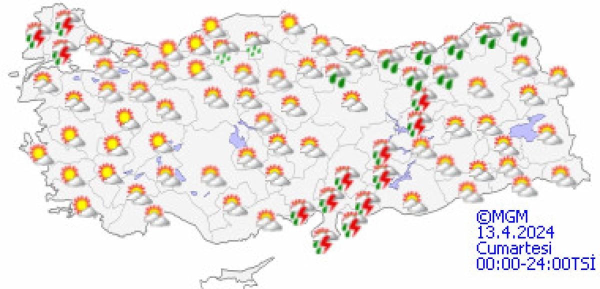 Yapılan son değerlendirmelere göre, yurdun iç ve doğu kesimlerinin çok bulutlu, Akdeniz'in iç kesimleri, Doğu Karadeniz’in iç kesimleri, Doğu Anadolu'nun güney ve doğusu, Güneydoğu Anadolu ile Samsun ve Ordu'nun iç kesimlerinin sağanak ve yer yer gök gürültülü sağanak yağışlı, diğer yerlerin parçalı ve az bulutlu geçeceği tahmin ediliyor.