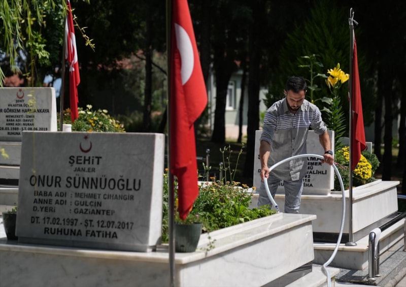 Hava ve Polis Şehitliği'ni ziyaret eden şehit yakınları ve gaziler, Türk bayraklarıyla donatılmış kabirlerin bakımlarını yaparak dualar edip, Kur'an-ı Kerim okudu.