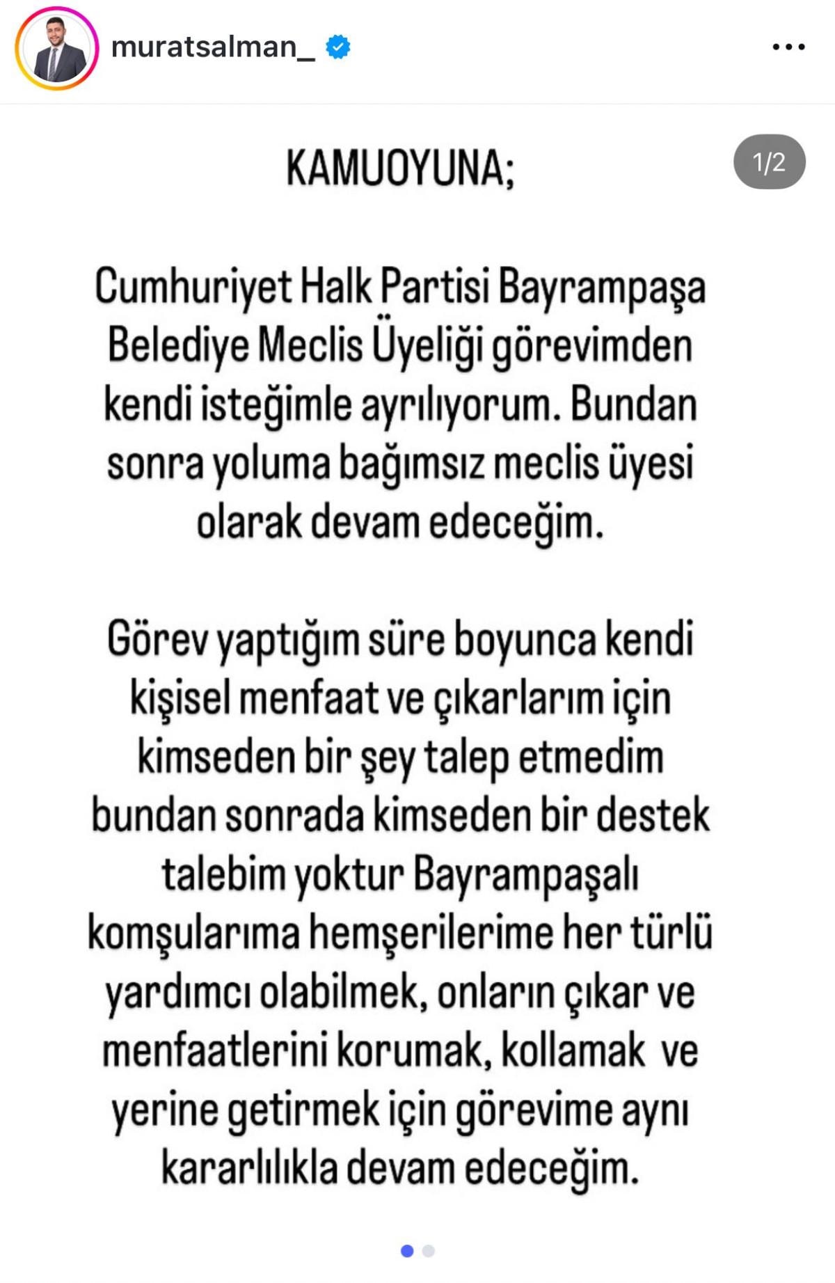 Cumhuriyet Halk Partisi Bayrampaşa Belediye Meclis Üyeliği görevimden kendi isteğimle ayrılıyorum. Bundan sonra yoluma bağımsız meclis üyesi olarak devam edeceğim. Görev yaptığım süre boyunca kendi kişisel menfaat ve çıkarlarım için kimseden bir şey talep etmedim, bundan sonrada kimseden bir destek talebim yoktur.