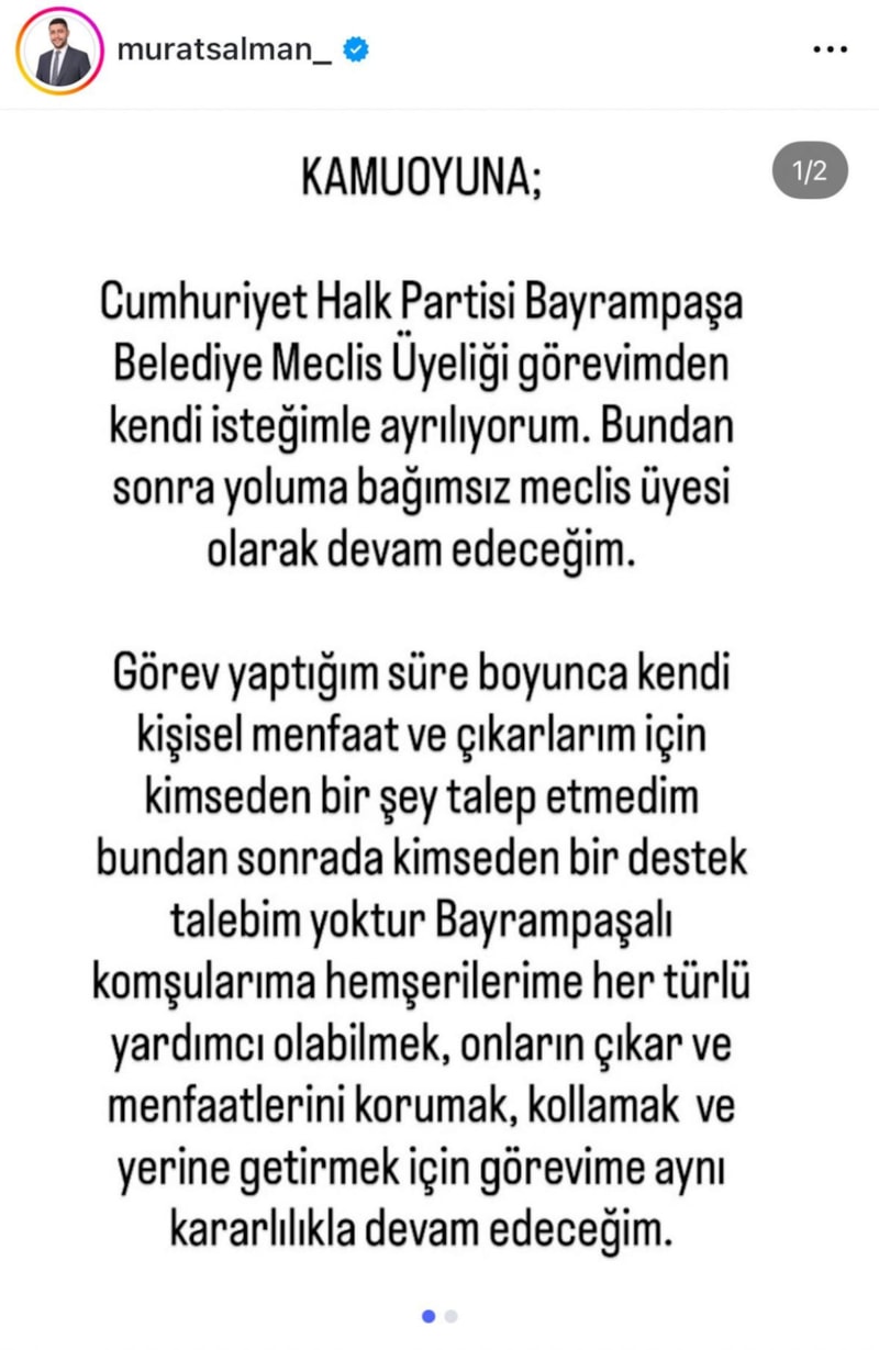 Cumhuriyet Halk Partisi Bayrampaşa Belediyesi Meclis Üyesi Murat Salman, partisinden istifa ettiğini duyurarak bundan sonra bağımsız meclis üyesi olarak devam edeceğini açıkladı.
