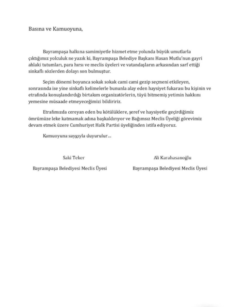 "Bayrampaşa halkına samimiyetle hizmet etme yolunda büyük umutlarla çıktığımız yolculuk ne yazık ki, Bayrampaşa Belediye Başkanı Hasan Mutlu’nun gayri ahlaki tutumları, para hırsı ve meclis üyeleri ve vatandaşların arkasından sarf ettiği sinkaflı sözlerden dolayı son bulmuştur.