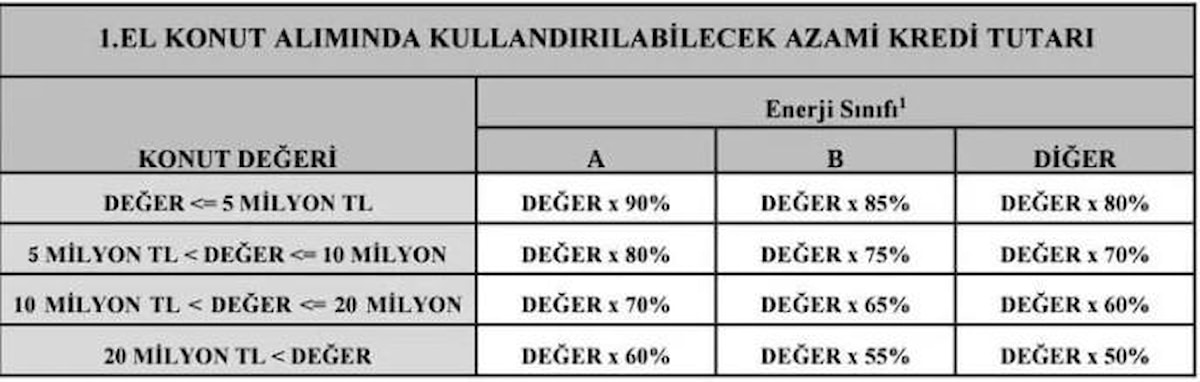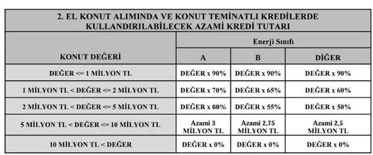 Değeri 1 milyon TL’nin altında kalan ikinci el konutlarda azami kredi tutarı yüzde 90 olacak. 1 milyon ile 2 milyon TL’ye sahip ikinci el konutlarda azami kredi tutarları farklı enerji sınıflarına göre yüzde 60-70 arasında değişecek.