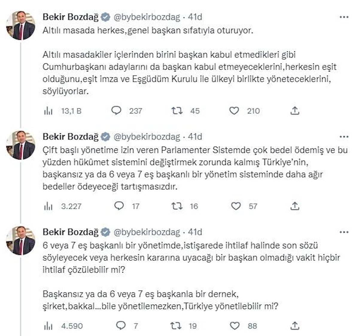 6 veya 7 eş başkanlı bir yönetimde, istişarede ihtilaf halinde son sözü söyleyecek veya herkesin kararına uyacağı bir başkan olmadığı vakit hiçbir ihtilaf çözülebilir mi? Başkansız ya da 6 veya 7 eş başkanla bir dernek, şirket, bakkal bile yönetilemezken, Türkiye yönetilebilir mi?