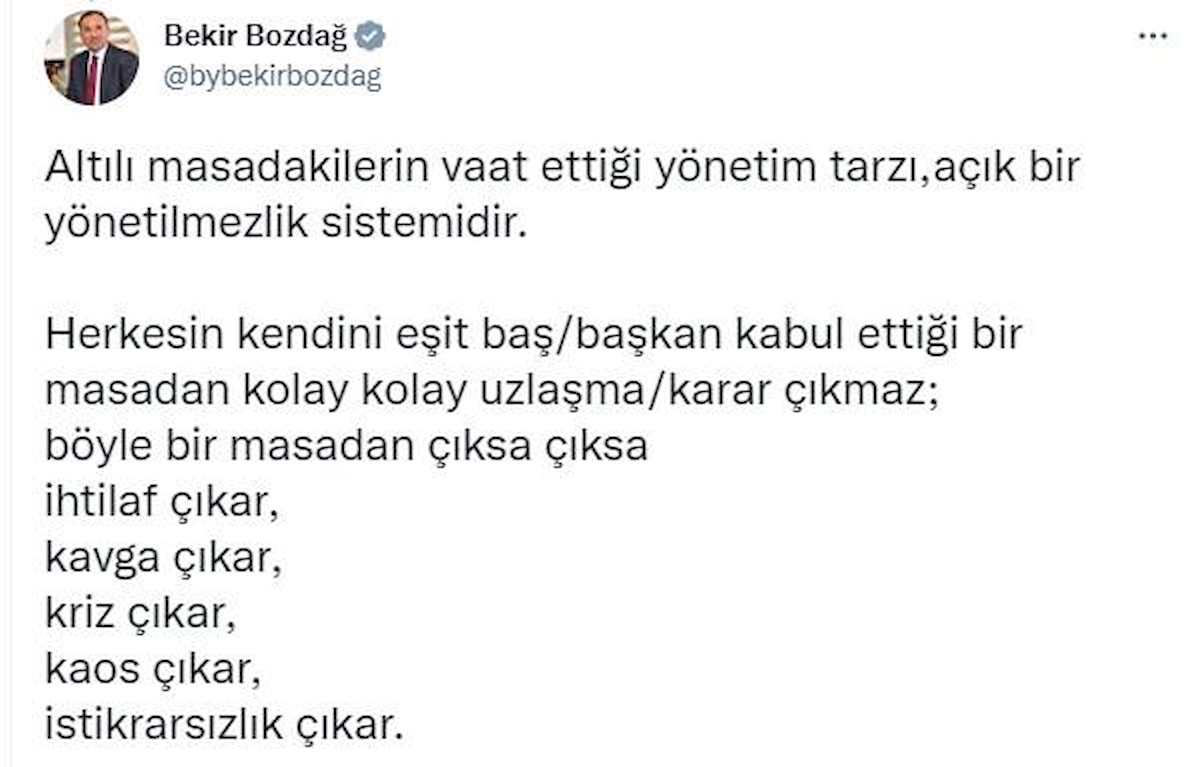 Herkesin kendini eşit baş/başkan kabul ettiği bir masadan kolay kolay uzlaşma/karar çıkmaz; böyle bir masadan çıksa çıksa ihtilaf çıkar, kavga çıkar, kriz çıkar, kaos çıkar, istikrarsızlık çıkar."