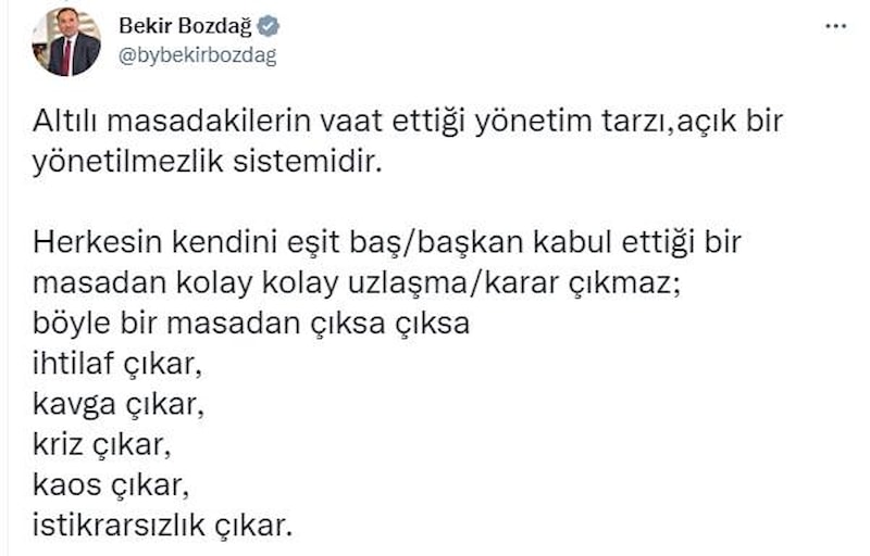 "Altılı masada herkes, genel başkan sıfatıyla oturuyor. Altılı masadakiler içlerinden birini başkan kabul etmedikleri gibi Cumhurbaşkanı adaylarını da başkan kabul etmeyeceklerini, herkesin eşit olduğunu, eşit imza ve Eşgüdüm Kurulu ile ülkeyi birlikte yöneteceklerini, söylüyorlar.