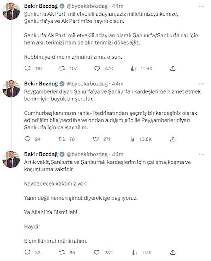 Şanlıurfa AK Parti milletvekili adaylarının hayırlı olmasını dileyen Bozdağ, şunları yazdı: