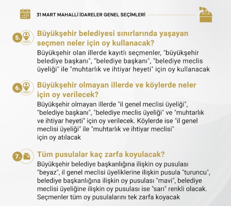 Büyükşehir belediye başkanlığına ilişkin oy pusulası "beyaz", il genel meclisi üyeliklerine ilişkin pusula "turuncu", belediye başkanlığına ilişkin oy pusulası "mavi", belediye meclisi üyeliğine ilişkin oy pusulası ise "sarı" renkli olacak. Seçmenler tüm oy pusulalarını tek zarfa koyacak.
