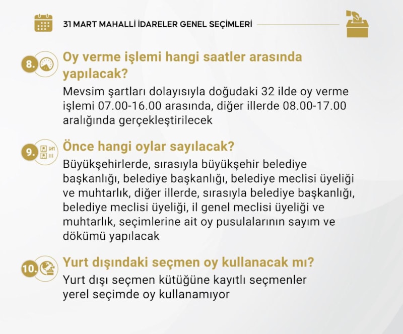 Büyükşehirlerde, sırasıyla büyükşehir belediye başkanlığı, belediye başkanlığı, belediye meclisi üyeliği ve muhtarlık, diğer illerde, sırasıyla belediye başkanlığı, belediye meclisi üyeliği, il genel meclisi üyeliği ve muhtarlık, seçimlerine ait oy pusulalarının sayım ve dökümü yapılacak.