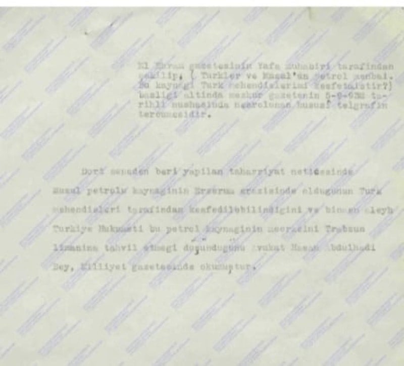 Belgeye göre, Musul petrollerini besleyen ana damarlar, Erzurum topraklarından başlıyor ve o dönemde Türk mühendisler tarafından tespit edilmişti.