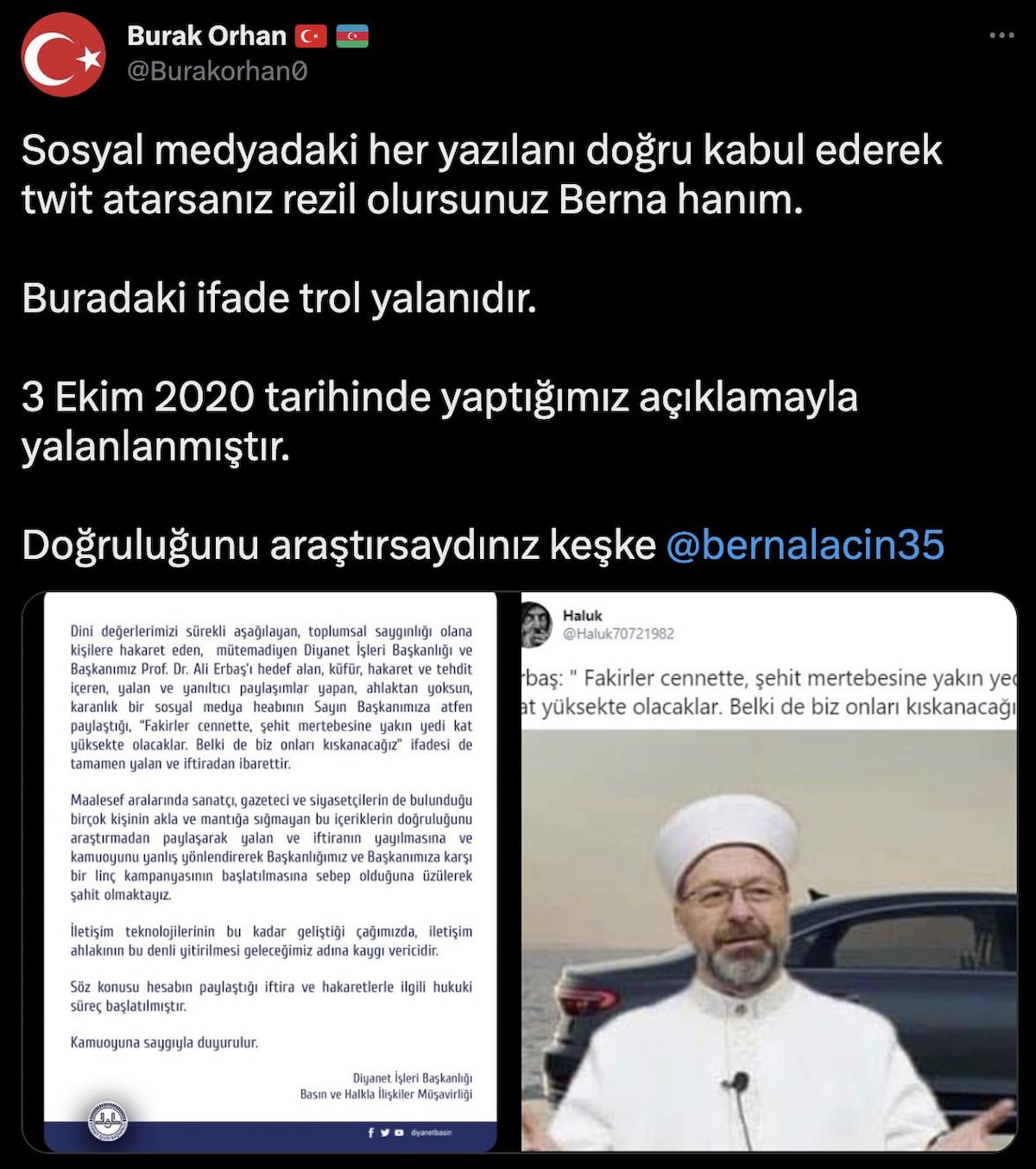 Söz konusu yalanın 3 yıl önce yalanlandığını hatırlatan Orhan, "Sosyal medyadaki her yazılanı doğru kabul ederek twit atarsanız rezil olursunuz Berna Hanım. Buradaki ifade trol yalanıdır. 3 Ekim 2020 tarihinde yaptığımız açıklamayla yalanlanmıştır. Doğruluğunu araştırsaydınız keşke." ifadelerini kullandı.