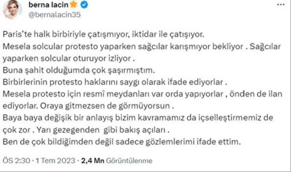 Sık sık Twitter'da yaptığı paylaşımları ve ülkesini yermesiyle de herkesin tepkisini alan Berna Laçin, Fransa'daki olaylara da el ettı.