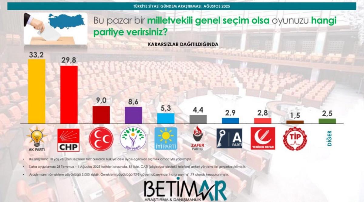 Betimar'ın yapmış olduğu anket sonucu ve diğer partilerin oy oranları ise şu şekilde: