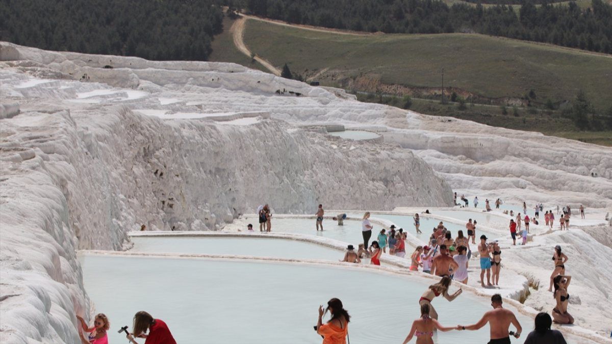 Bölgede etkili olan güneşli havayı fırsat bilen turistler travertenlerde gezip, güneşlendi. Turistler, antik havuza girmeyi de ihmal etmedi.