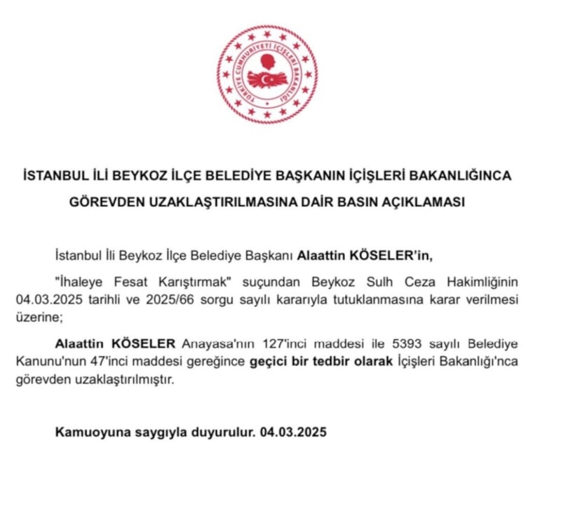 Açıklamada, "İstanbul ili Beykoz ilçe Belediye Başkanı Alaattin Köseler'in 'ihaleye fesat karıştırmak' suçundan Beykoz Sulh Ceza Hakimliğinin 4 Mart 2025 tarihli ve 2025/66 sorgu sayılı kararıyla tutuklanmasına karar verilmesi üzerine; Alaattin Köseler Anayasa'nın 127'nci maddesi ile 5393 sayılı Belediye Kanunu'nun 47'nci maddesi gereğince geçici bir tedbir olarak İçişleri Bakanlığı'nca görevden uzaklaştırılmıştır." denildi.